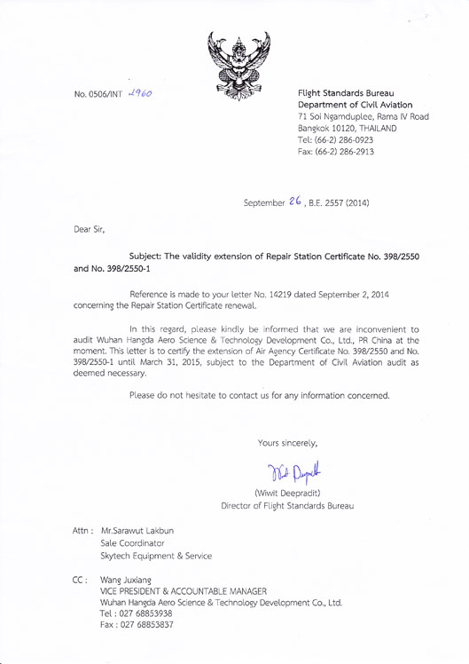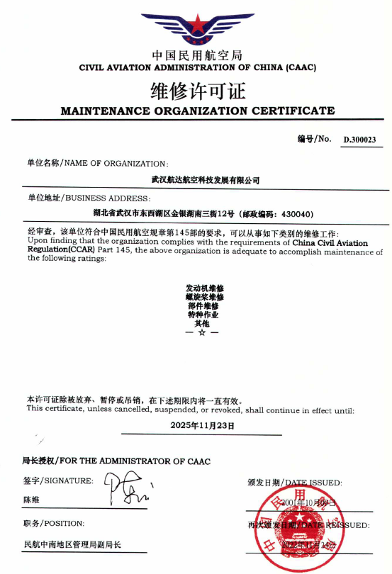 2001年10月 公司獲中國民航總局授權的民航維修許可證。